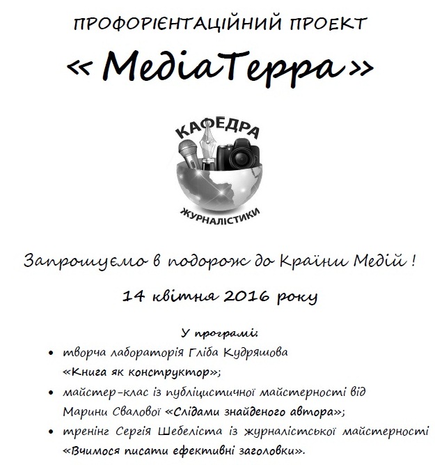Запрошуємо учнів шкіл міста і області взяти участь у профорієнтаціному проекті «МедіаТерра», який відбудеться 14 квітня 2016 року на факультеті філології та журналістики в Полтавському національному педагогічному університеті імені В.Г. Короленка.
