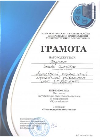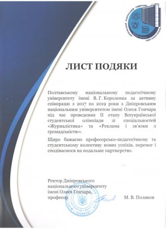 Також Дніпровський національний університету імені Олеся Гончара висловив удячність Полтавському національному педагогічному університету імені В.Г. Короленка за трирічну співпрацю під час проведення ІІ етапу Всеукраїнської олімпіади зі спеціальностей «Журналістика» та «Реклама і зв’язки з громадськістю», а кафедрі журналістики – за підготовку студентів до конкурсу.