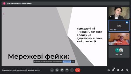 16 листопада 2022 р. на кафедрі журналістики Полтавського національного педагогічного університету імені В.Г. Короленка відбувся попередній онлайн-захист кваліфікаційних робіт здобувачів другого рівня вищої освіти (магістр) зі спеціальності Журналістика денної та заочної форм навчання. Магістранти представили розвідки, присвячені актуальним питанням журналістики, реклами, піару, медіаосвіти, зокрема, ˗ новим викликам, які постали перед українськими медійниками після 24 лютого 2022 року.