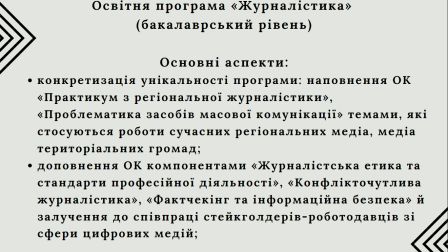 Марина Свалова, гарантка освітньої програми «Журналістика» першого (бакалаврського) рівня, яка проходила акредитаційну експертизу, ознайомила з рекомендаціями щодо подальшого вдосконалення освітньої програми, здійсненими на основі звіту експертної групи та висновків галузевої експертної ради, зазначила, що для конкретизації унікальності програми варто наповнити ОК «Практикум з регіональної журналістики», «Проблематика засобів масової комунікації» темами, які стосуються роботи сучасних регіональних медіа, медіа територіальних громад.