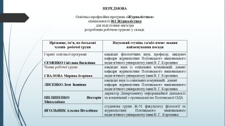 Членкиня робочої групи, директорка департаменту інформаційної діяльності та комунікацій з громадськістю Полтавської обласної військової адміністрації Вікторія Пилипенко, зазначила, що особливу увагу при укладанні ОП «Журналістика» другого (магістерського) рівня було приділено практичній підготовці: відповідно до вимог стандарту вищої освіти зі спеціальності 061Журналістика було введено такі види практики: «Виробнича практика в медіагалузі» (12,5 кредитів) і «Виробнича з управління медійними та медіаосвітніми проєктами».