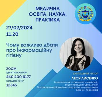 27 лютого 2024 року доцента кафедри журналістики Полтавського національного педагогічного університету імені В.Г.Короленка Леся Лисенко прочитала лекцію «Чому важливо дбати про інформаційну гігієну?» для викладачів та студентів Житомирського медичного інституту та фахового коледжу Житомирського медичного інституту Житомирської обласної ради.