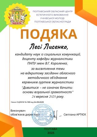 24 вересня 2025 року доцента кафедри журналістики Полтавського національного педагогічного університету імені В. Г. Короленка Леся Лисенко провела тренінг «Дивитися – не значить бачити: основи візуальної грамотності» для педагогів із закладів позашкільної освіти Полтавської області, а також із Кривого Рогу, Вінниці, Черкас, Чернівців та Києва. Захід став частиною програми Відкритого обласного методичного об’єднання керівників гуртків журналістики, координатором якого є методист Полтавського обласного центру естетичного виховання учнівської молоді Яна Лебідь.